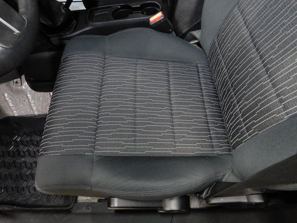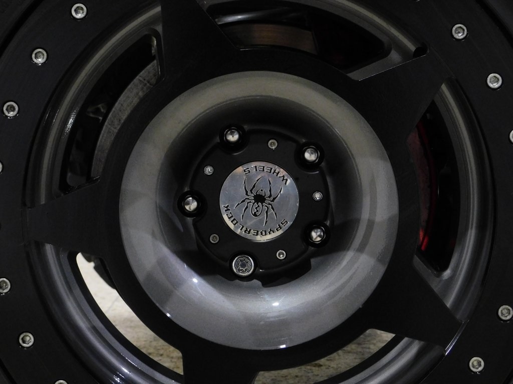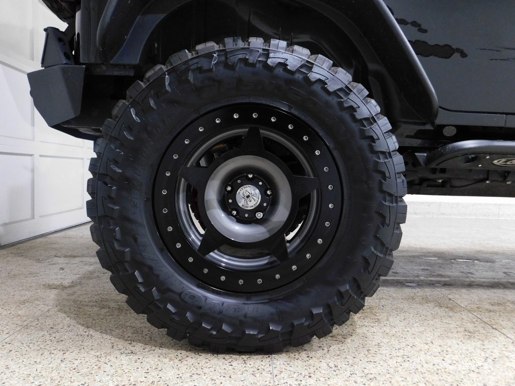 The bodywork is finished in black with a replacement fastback-style black soft top. Exterior details include a Smittybilt SRC Stinger front bumper and XRC 12k winch, an LED light bar, a red grille, LED headlights, a vented hood finished in black primer, Bushwacker extended fenders, removable doors, LOD rock sliders, and a Smittybilt XRC rear bumper with an integrated receiver hitch.Black-finished 20 Spyderlock beadlock wheels are mounted with 38×15.50 Toyo M/T Open Country tires, and a matching spare is affixed to the rear carrier. The suspension is modified with a 6 Rough Country X-Flex lift, and stopping power is provided by four-wheel Brembo disc brakes. The wheels and tires extend beyond the plane of the fenders.