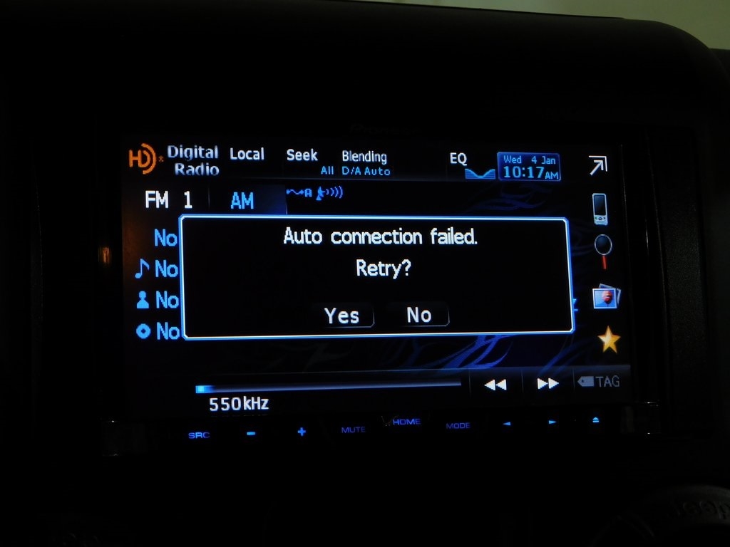 Appointments include air conditioning, cruise control, crank windows, a rearview camera, and Pioneer touchscreen infotainment linked to an ARC Audio amplifier and Infinity speakers. A 10 subwoofer is housed in a custom enclosure on the tailgate. The 6.4-liter V8 was sourced from a Grand Cherokee SRT-8 and was retrofitted in 2015. The engine was factory rated at 470 horsepower and 465 lb-ft of torque and features a Dakota Customs conversion kit and a Borla cat-back exhaust system.
