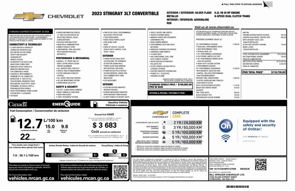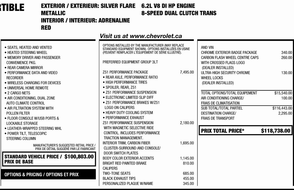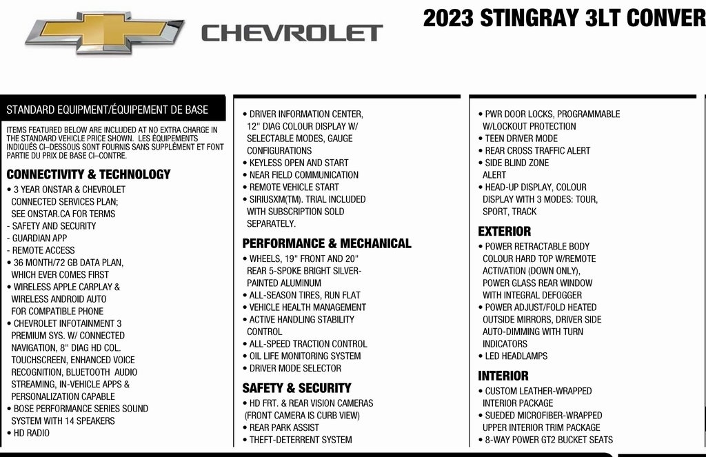 CALL NOW Winter is coming Save Now Z51Performance package, Z51 Performance suspension, Carbon Fiber Interior Trim, Body Color Exterior Accents, Head-Up Display, Black Exhaust Tips, Memory Side Mirrors, On-Star, Paddle Shifters, Parallel and Perpendicular Park Assist, Remote Start System, Rear Sonar Assist, Cross Traffic Alert, BOSE 14 Speaker Performance Series Sound System, Bright Red-Painted Calipers, Chrome Exterior Badge Package, Custom Leather Wrapped Interior Package, Electrical Theft Deterrent System, Electronic Limited-Slip Differential, Front Dual Zone A/C, GPS Navigation System, GT Sport Steering Wheel, GT2 Bucket Seats, HD Front & Rear Vision Cameras, Head-Up Display, Heated & Cooled Driver & Passenger Seats, Heated Steering Wheel, Heavy-Duty Cooling System, Memory Driver & Passenger Convenience Package, Memory Driver's Seat, Performance Data & Video Recorder, Performance Rear Axle Ratio, Performance Traction Management, Power Convertible HardTop, Power Tilt / Telescopic Steering Column with Memory, Power-Adjustable Outside Heated Mirrors, Preferred Equipment Group 3LT, Premium audio system: Chevrolet Infotainment 3 Premium, Rear Cross Traffic Alert, Rear Z51 Spoiler, Side Blind Zone Alert, Sirius XM Satellite Radio, Sueded Microfiber-Wrapped Upper Interior Trim Pkg, Universal Home Remote, Vehicle Inclination Theft Deterrent Sensor, Vehicle Interior Movement Theft Deterrent Sensor, Wheels: 19" x 8.5" Fr/20" x 11" Rr Bright Silver, Wireless Apple CarPlay/Wireless Android Auto, Wireless Charging for Devices, Z51 Performance Brakes, Z51 Performance Exhaust w/Stainless-Steel Tips, Z51 Performance Package, Z51 Performance Suspension, Z51 Performance Suspension with Magnetic Selective Ride Control.
