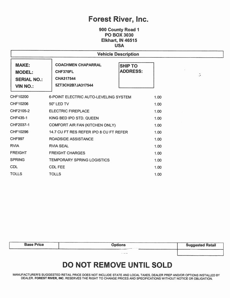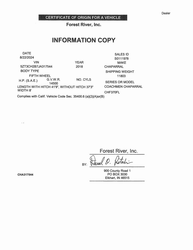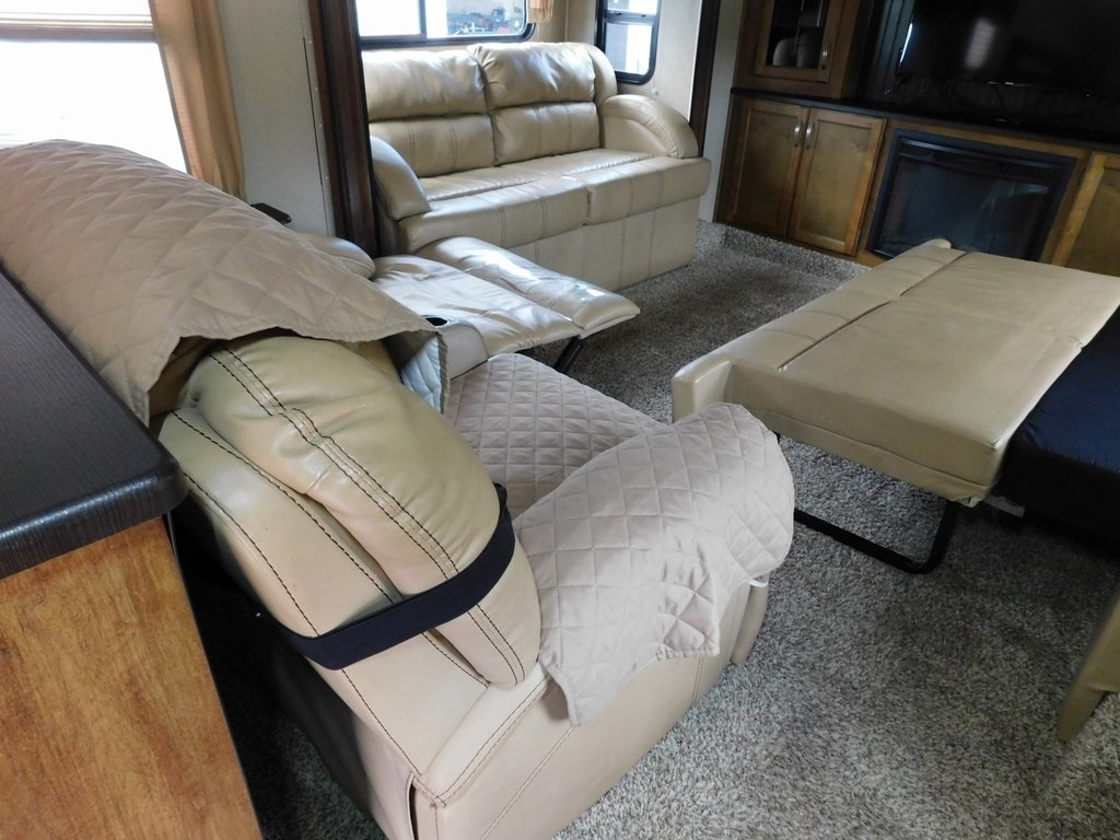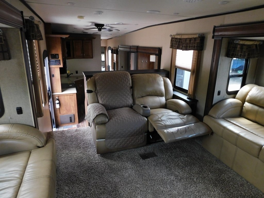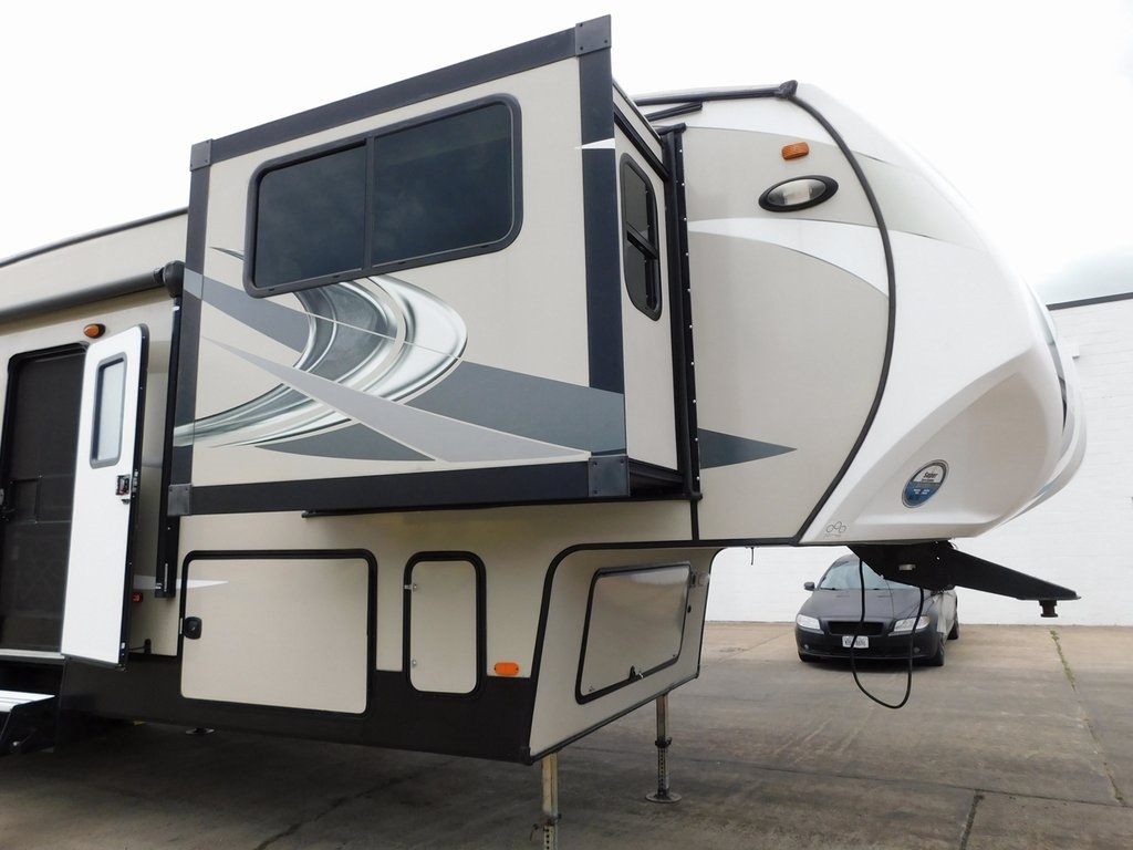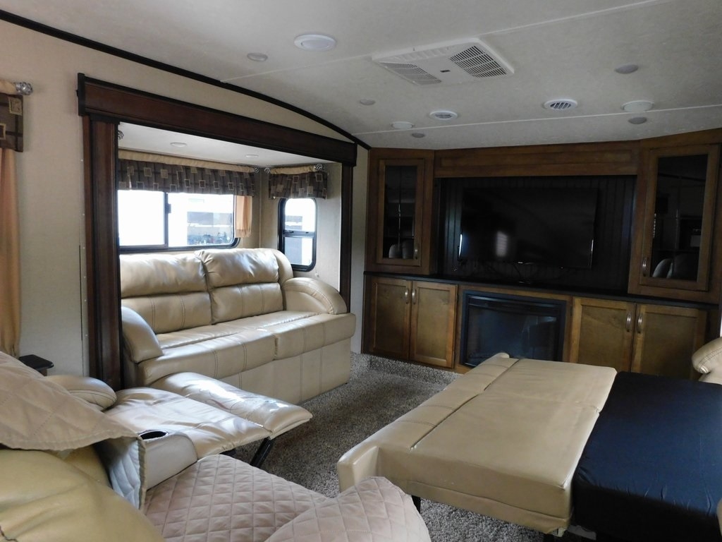 Call our sales team here at 716-649-6695 to schedule an appointment to view this Chaparral 370FL! Clean CARFAX! Beautiful 2018 Forest River Coachmen Chaparral 370FL Class A Fifth Wheel RV with all the amenities! New Awning never used, New Microwave, New F Rated Tires & New Spare. Lots of other service history available. Extra Clean call now! Motivated Seller. Truck and Trailer. Maximum Sleeping Capacity: 6, Length: 41' 9" (12.7 m), Extendable Dinette Table with 2 Chairs, Standard Shower, DVD Player, Television, Standard Master Bedroom, King Size Bed, Kitchen Sink, Front and Rear Power Leveling Jacks, Convertible Sofa Bed, Dual Reclining Love Seat, Mid-Size Refrigerator with Freezer, Oven/Stove/ 3 Gas Burners, 20' Power Retractable Patio Awning, GVWR: 14,500 lbs, Air Conditioning BTUs: 15,000, Porcelain Toilet, Bathroom Sink / Mirror / Medicine Cabinet and Greystone Electric Fireplace! Original equipment and options list available upon request!