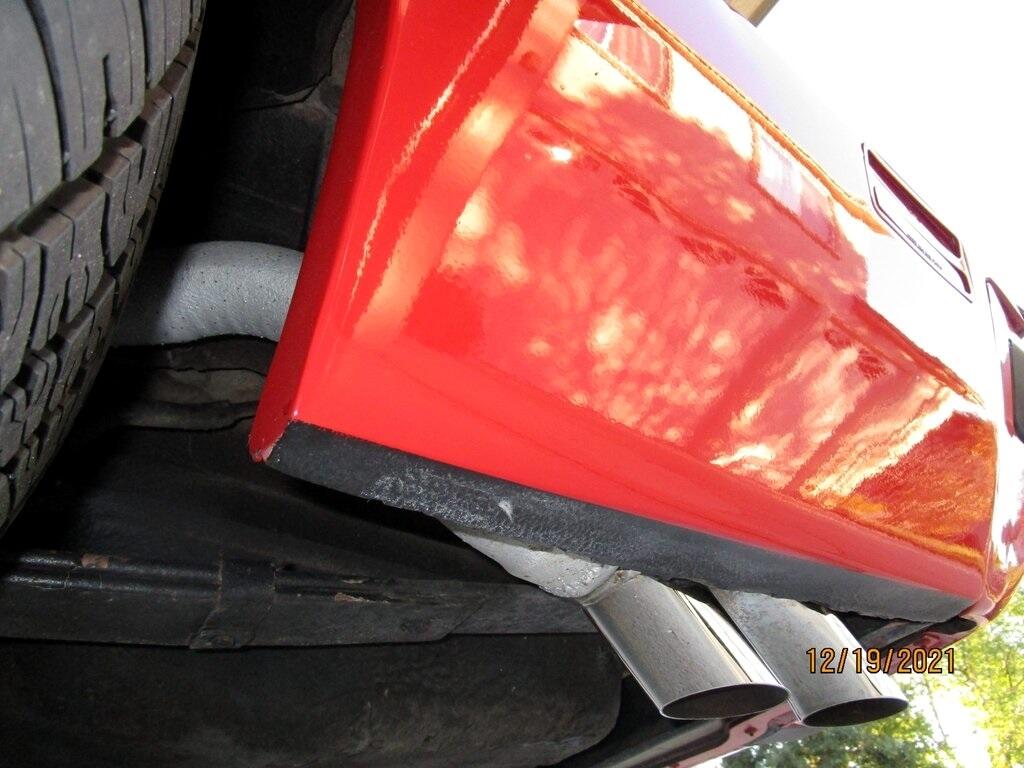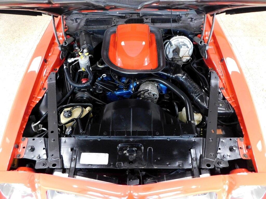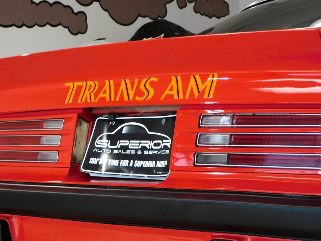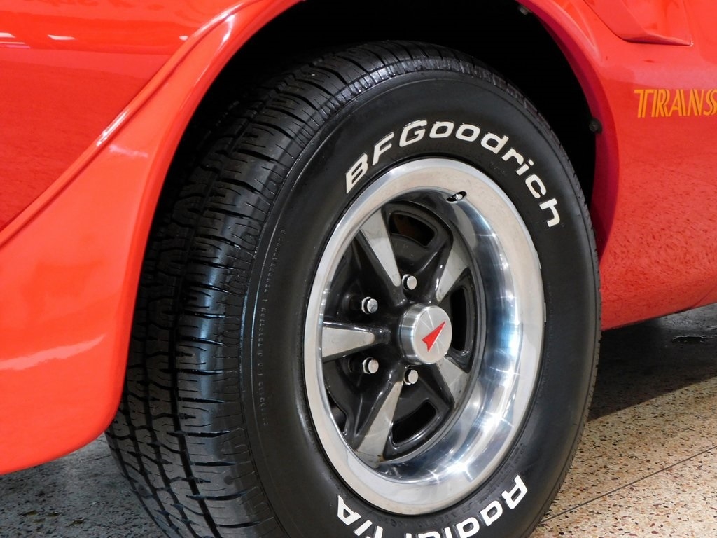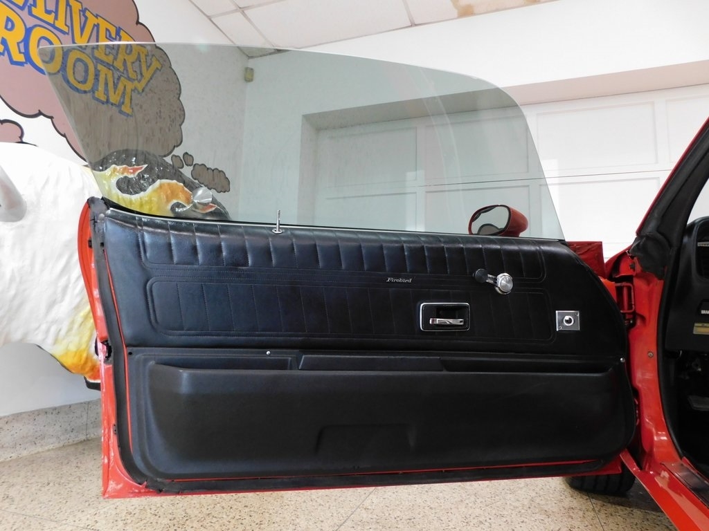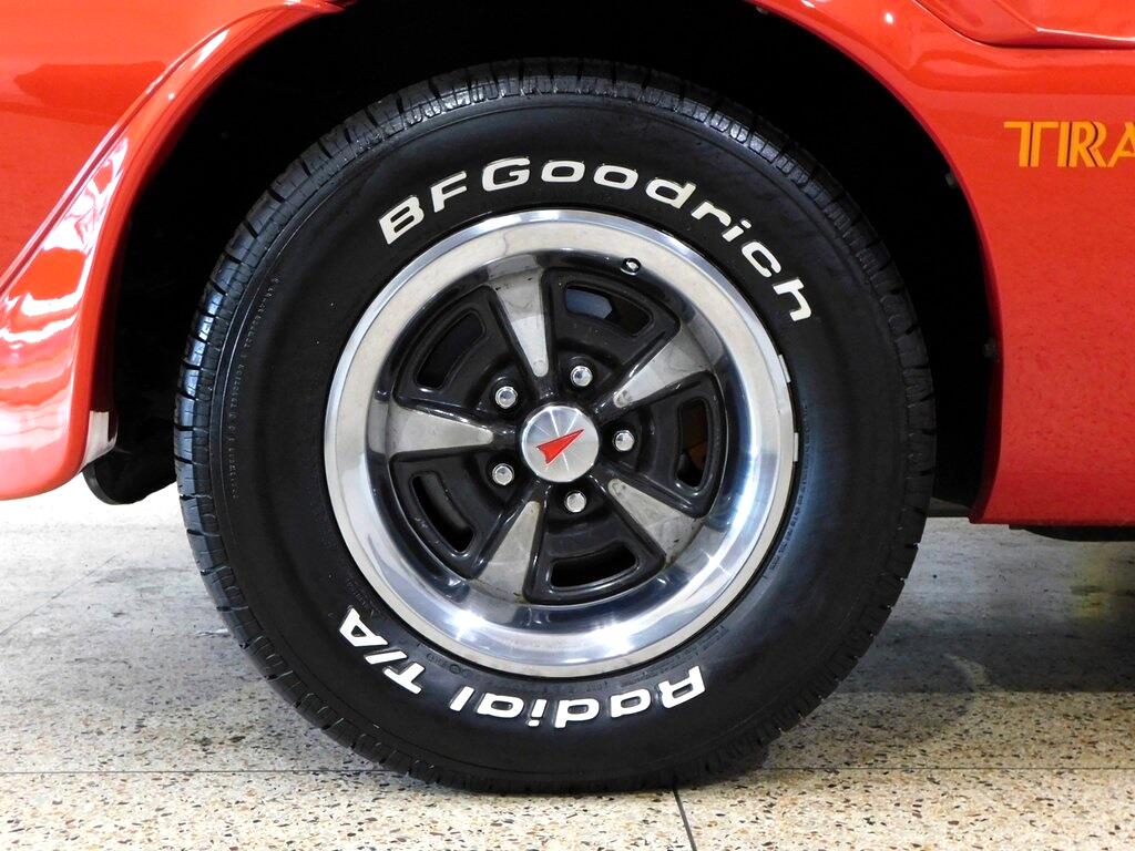 The body was refinished in red during prior ownership and features a "screaming chicken" hood decal, a shaker hood, chrome window trim, front and rear spoilers, and quad exhaust tips.