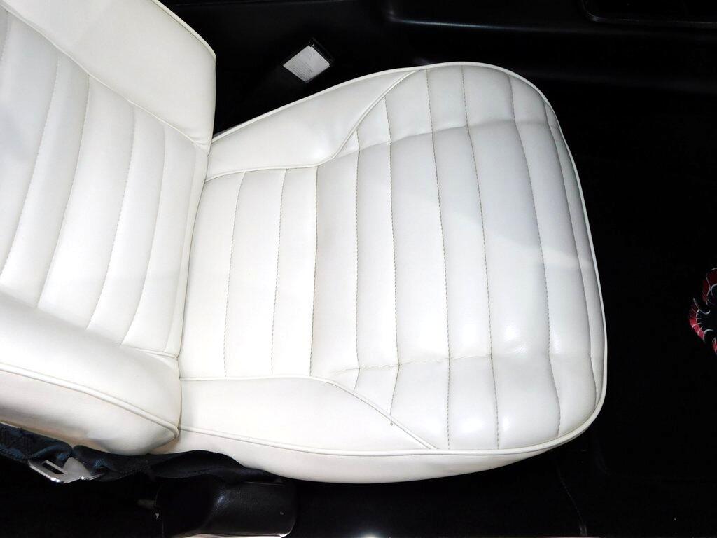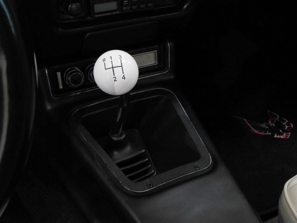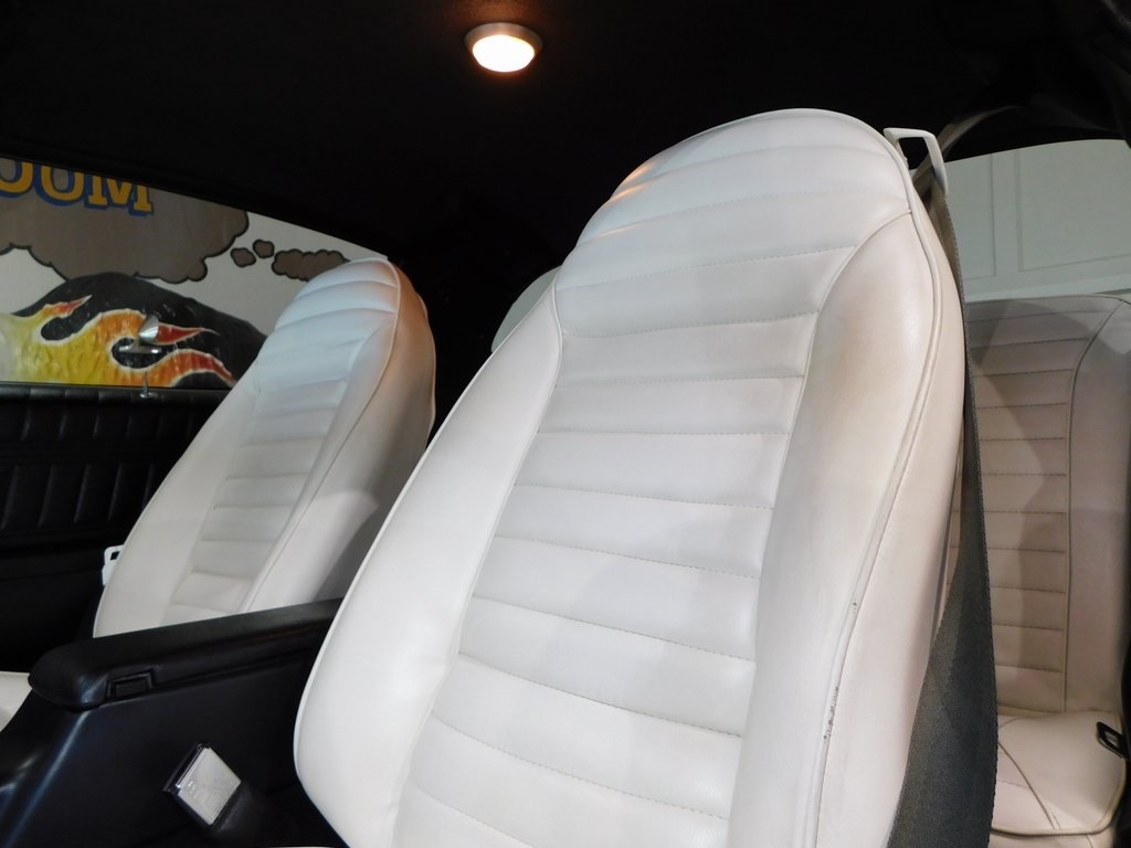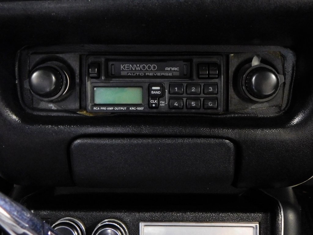 The cabin features high-back front bucket seats with white upholstery, along with contrasting black door panels and carpets. Equipment includes air conditioning, a Hurst shifter, and a Kenwood cassette stereo. The seller states that the air-conditioning compressor was replaced during current ownership.