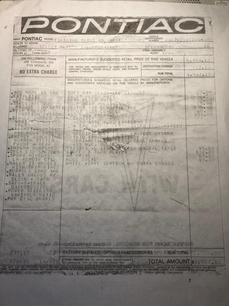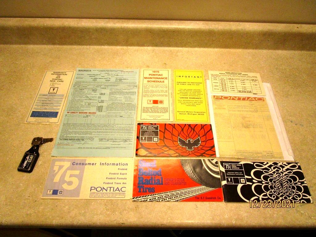 This 1975 Pontiac Firebird Trans Am is claimed to be one of 857 produced for the model year that were equipped with a 455ci V8. This example is finished in red over white upholstery, and equipment includes a four-speed manual transmission, a shaker hood, front disc brakes, front and rear spoilers, Trans Am decals, front bucket seats, air conditioning, a Hurst shifter, and a Kenwood cassette stereo. The car was acquired by the previous owner in April 2021, and subsequent work reportedly included rebuilding the front calipers and replacing the air-conditioning compressor, master cylinder, brake booster, shock absorbers, and tires. This Trans Am is now offered by the seller on behalf of his son with a copy of a window sticker, an original purchase contract, manufacturer's literature, and a clean title.