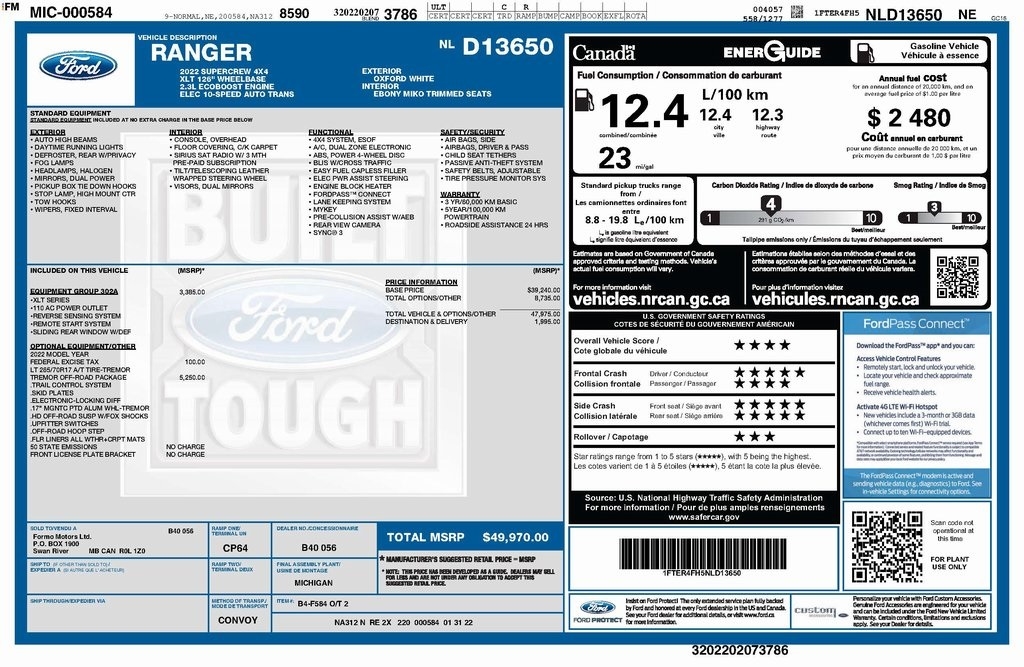 Sport Appearance Package, Trailer Tow Package, Tremor Off-Road Package, Equipment Group 302A High, Class IV Trailer Hitch Receiver, SYNC 3, Apple CarPlay/Android Auto, Terrain Management System, Traction Control, Trail Control, Drop In Bed Liner, Remote Start System, Rear Backup Camera, Reverse Sensing System, Remote Start System, Front Miko Suede-Trimmed Bucket Seats, Heated Front Seats, Forward Collision Warning with AEB, Rear Sonar Assist, Blind Spot Monitor, Lane Departure Warning, Lane Keeping System, Black Mesh Grille w/Magnetic Painted Surround, Black Off-Road Hoop Steps, Front Fog Lights, Manual-Sliding Rear-Window, Off-Road Tuned Suspension w/FOX Dampers, Power Mirrors w/Heated Glass, Sirius XM Satellite Radio, Mud Flaps, Trailer Sway Control and 17" Magnetic Painted Aluminum Wheels!