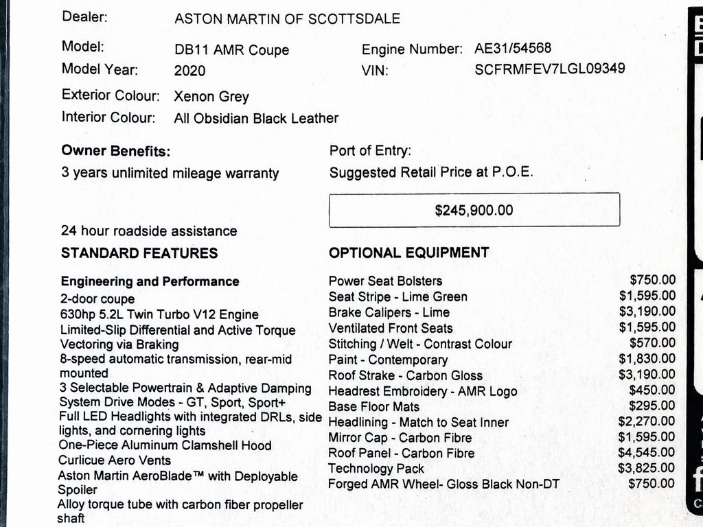 Flawless One Owner - Xenon Grey-Clean Car Fax 5.2L V12, 630HP V12 DB11 AMR Carbon Fiber Roof Strake, Carbon Fiber Roof Panel, Carbon Fiber Mirror Caps, Brake Calipers - Lime, Forged AMR Gloss Black Wheels, Paint Contemporary, Battery Conditioner, Embroidered AMR Logo on Seat Headrest, Lime Green Seat Stripe, Heated & Ventilated Front Seats, Lime Contrast Leather Seat Center Strap, Q 2x2 Twill Gloss Carbon Fiber Mirror Caps, Q 2x2 Twill Gloss Carbon Fiber Roof Panel, Q 2x2 Twill Gloss Carbon Fiber Roof Strake, 20" Forged AMR Wheels. Original Unused Carpet mats, Weather Tech mats & Car Cover included. This DB11 is a one owner car from Arizona.