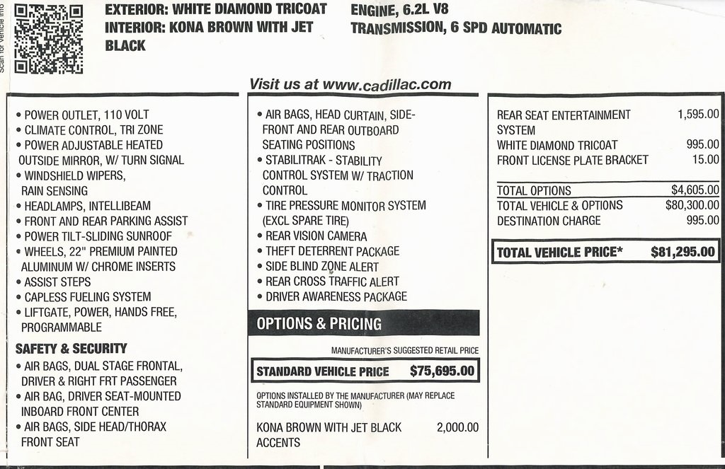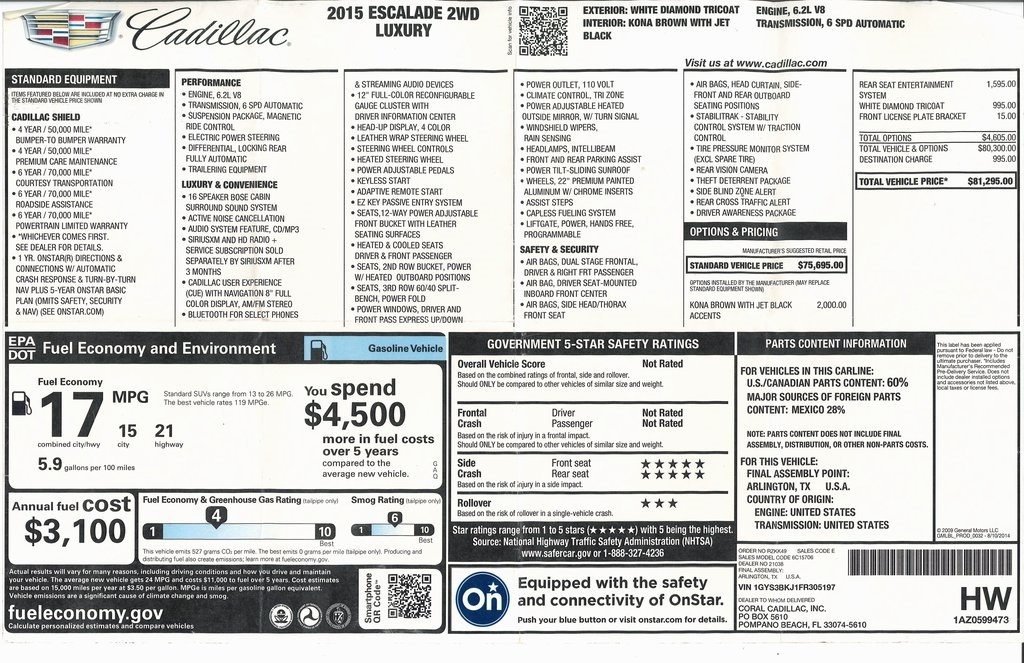 2015 Cadillac Escalade Luxury RWD SUV with 3rd Row 7-Passenger (2-2-3) Seating, Preferred Equipment Group 1SB, Tow Package, Driver Awareness Package, Remote Start, GPS Navigation System, BOSE Centerpoint Surround Sound System, Power Moonroof, Power Tilt / Telescopic Steering Column with Memory, Rear Backup Camera, Heads-Up Display, Heated & Cooled Front Bucket Seats, Heated Rear Seats, Heated Steering Wheel, Bluetooth, Front & Rear Sonar Park Assist, Memory Side Mirrors, Hands Free Power Liftgate, Cruise Control, Forward Collision Alert, Front Dual Zone A/C, IntelliBeam Headlamps, Lane Change Alert, Lane Departure Warning System, Memory Driver's Seat, Power Adjustable Pedals with Memory, Rear Cross-Traffic Alert, Reconfigurable 4-Color Head-Up Display, Second Row Bucket Seats, Side Blind Zone Alert, Sirius XM Satellite Radio and more!