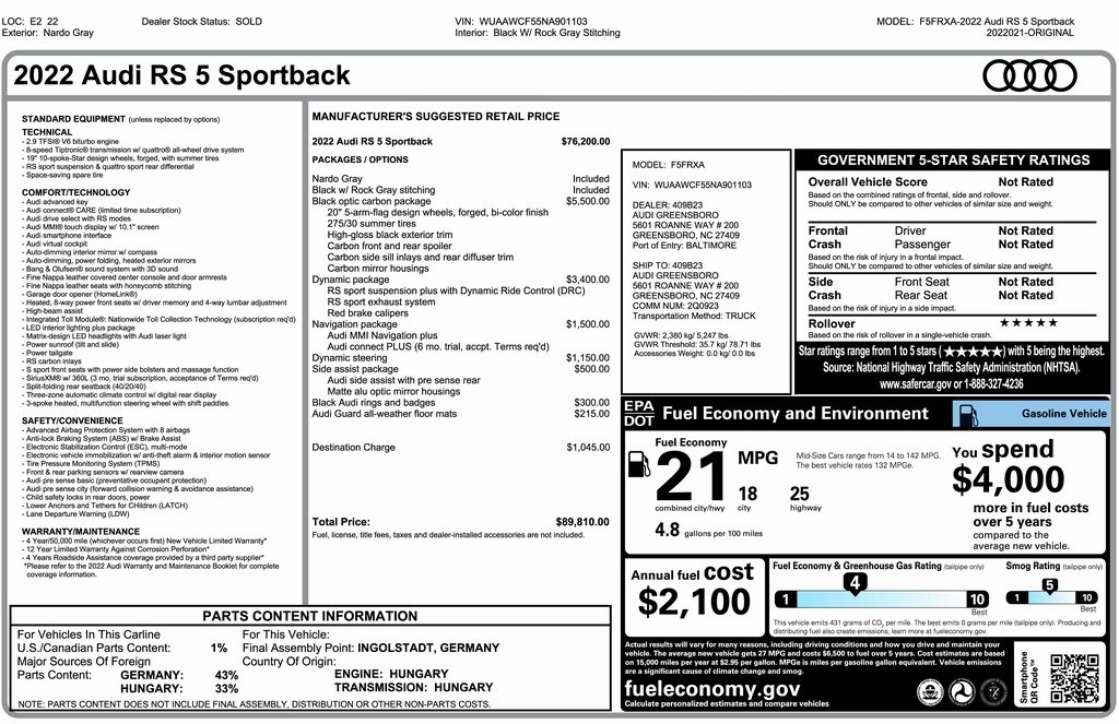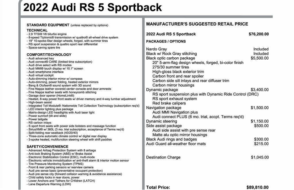 2 Owner RS5! Great Spec, Black Optic Carbon Fiber Package! Massaging Seats, Dynamic Package, Navigation Package, Side Assist Package, Dynamic Steering Package, Black Badges, Bang & Olufsen Sound System and More! Original window sticker available in the photo set!